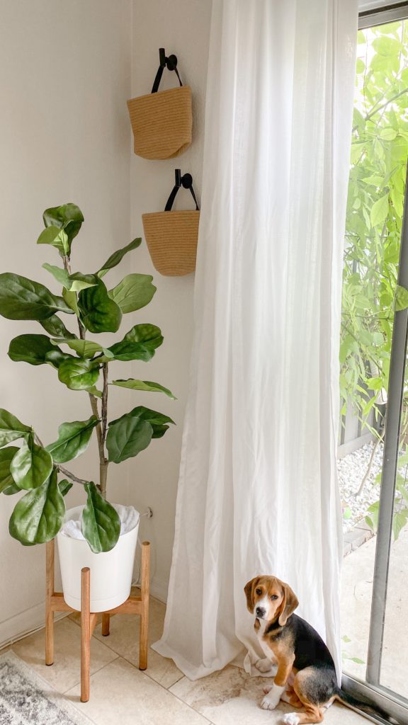 I kept it in this white planter and this wooden plant stand. (both from Amazon) I think it will go in our new dining room too once the puppies exit their beaver phase…