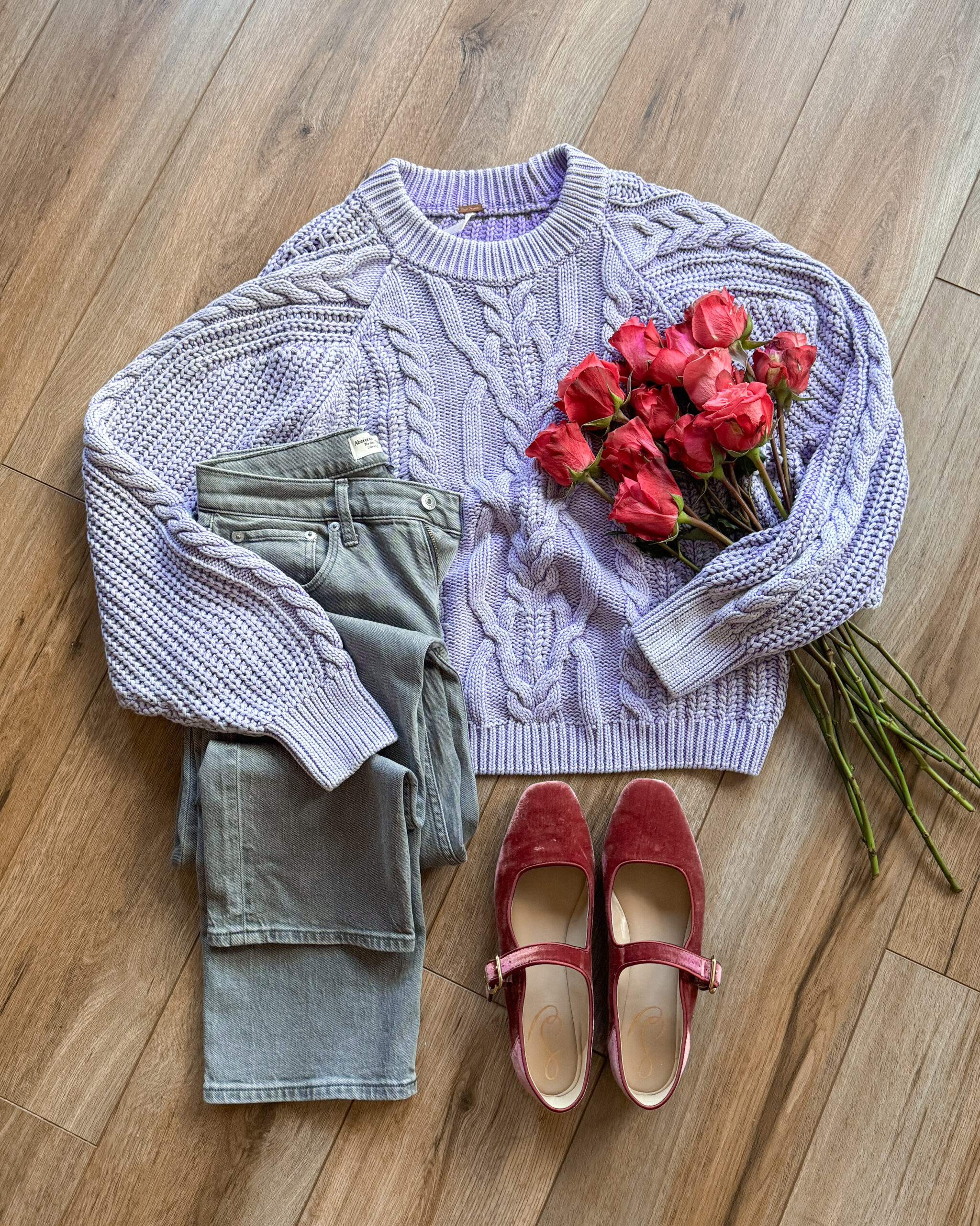 I love a monochrome moment! These light wash jeans with the lilac quilted jacket and lavender knit sweater is giving pastel sweet candy heart vibes.